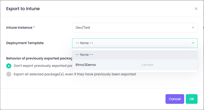 The Intune Deployment Template will now be available to use when the Intune instance specified in the template is selected as part of the Export to Intune pipeline in Patch360 or when exporting to Intune from Change360.