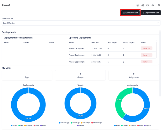 - On the Application List page select 1 or more applications, then select either + New Deployment or + New Phased Deployment.