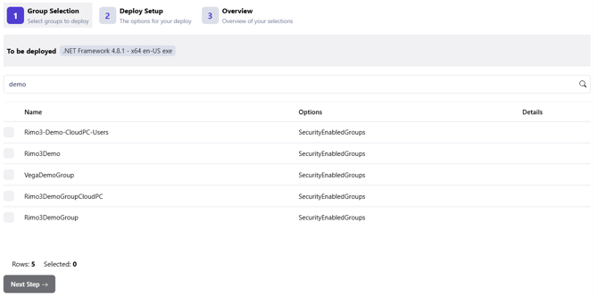 Select one or more groups to which the selected applications will be assigned, then click Next Step →