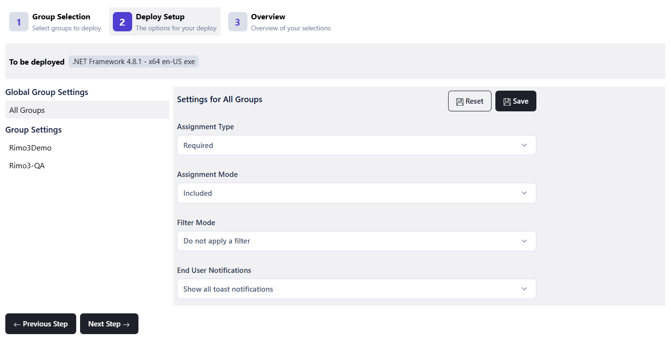 - On the Deploy Setup step you have the option to configure the setting for All Groups or each group individually. These settings represent how the assignment for each group will be configured for each of the selected apps.