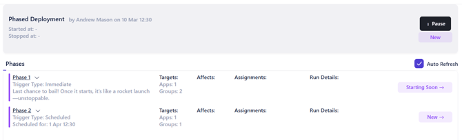You'll notice that Phase 1 will have an initial status of Starting Soon. Even if the trigger type for phase 1 is immediate there is a 30 second giving you the opportunity to Pause the deployment, if necessary, before the phase is executed.