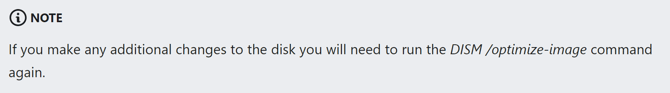 - From the other VM run DISM with the /optimize-image parameter, where D: is path to the disk of the configure VM: