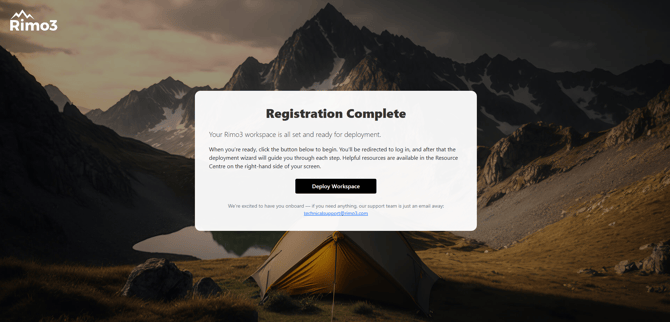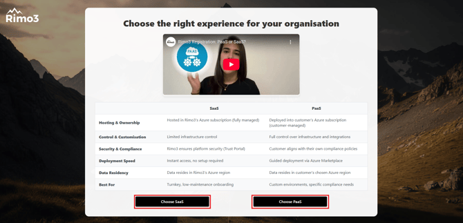 If you chose SaaS a workspace will be created and Rimo3 hosted resources will be deployed for you. This process typically completes within 24hrs and you will be informed via when your workspaces is ready to use.