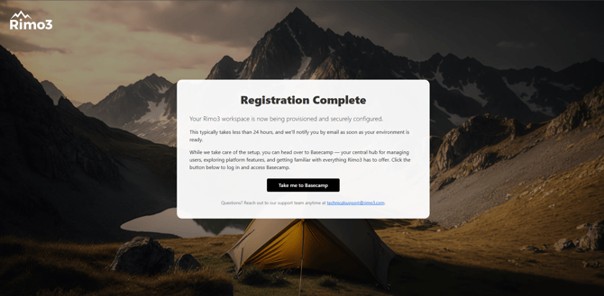 You won't have access to the main platform until the hosted resources are fully deployed, but in the meantime you can start exploring what Rimo3 has to offer via the Basecamp portal, where you can also start inviting additional users to your workspace.