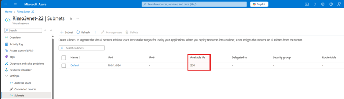 - In the Azure Portal browse to the Vnet used by the Gateway and select Subnets under Settings on the left hand menu. Check the Available IPs for the subnet to which the Gateway is attached: