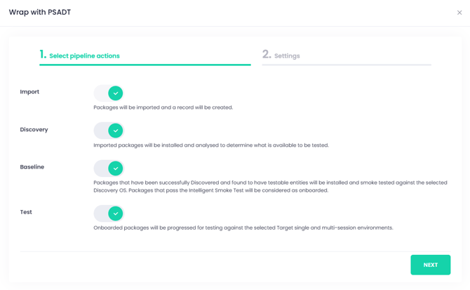 NOTE: The Wrap with PSADT button will only be enabled if at least one supported package is selected. If you have any unsupported packages selected a popup will display warning you that unsupported package will not be progressed. - Select pipeline for wrapped packages